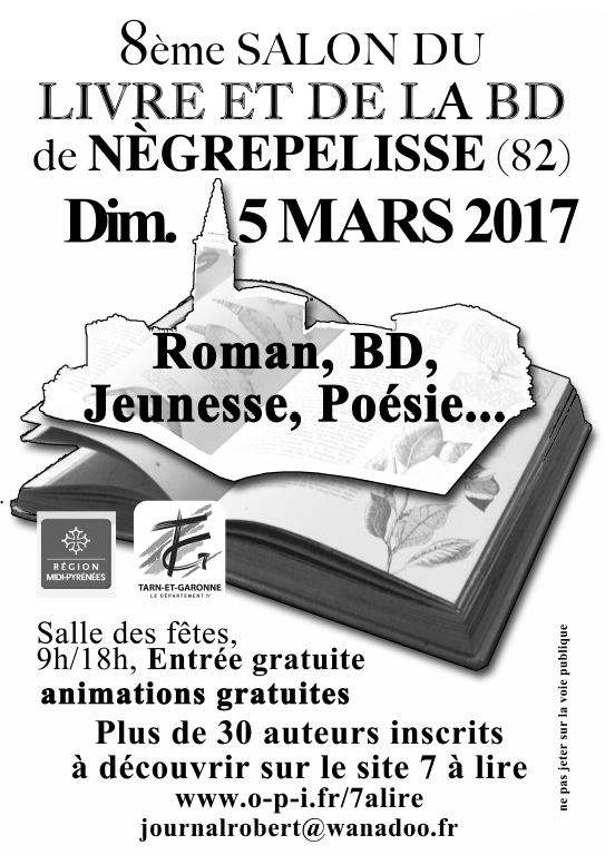 Le 6ième salon du livre et de la BD est organisé par l’association Autriche et Pays d’Oc et le site 7 à lire avec le soutien de la Mairie de Nègrepelisse, de la Cuisine centre d’art et de Design au château de Nègrepelisse, du Conseil général de Tarn et Garonne et du Conseil Régional de Midi-Pyrénées.