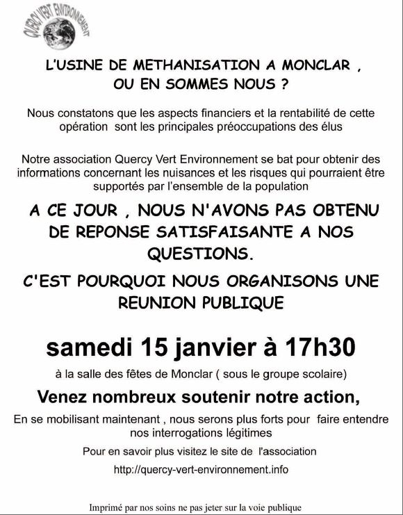 L’association Quercy Vert Environnement organise une réunion publique le Samedi 15 Janvier 2011.