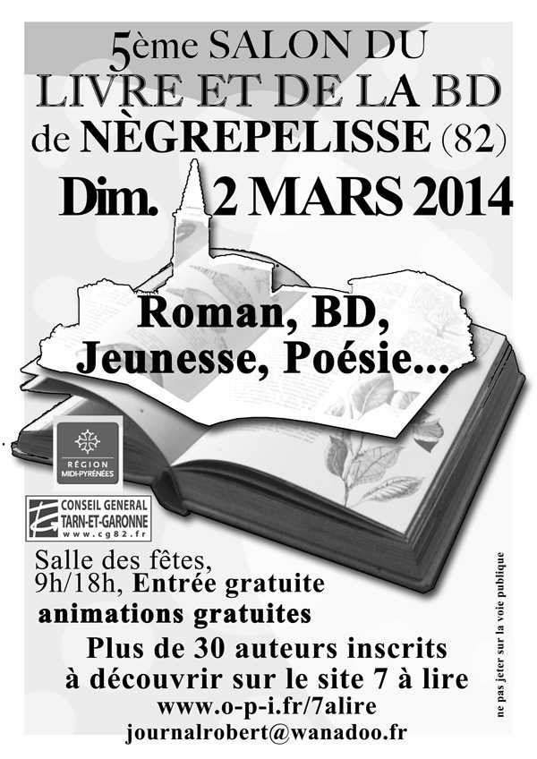 Je ne pourrais pas être présant au salon du livre de Nègrepelisse, je me fais opérer du genoux droir et mettre une prothèse le 20 février je bne serais donc pas en état d’être là