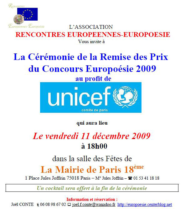 La remise des prix du concours Europoésie UNICEF 2009 aura lieu à la Mairie du 18ème de Paris le vendredi 11 décembre 2009 à 18h00, ci-dessous le palmarès.