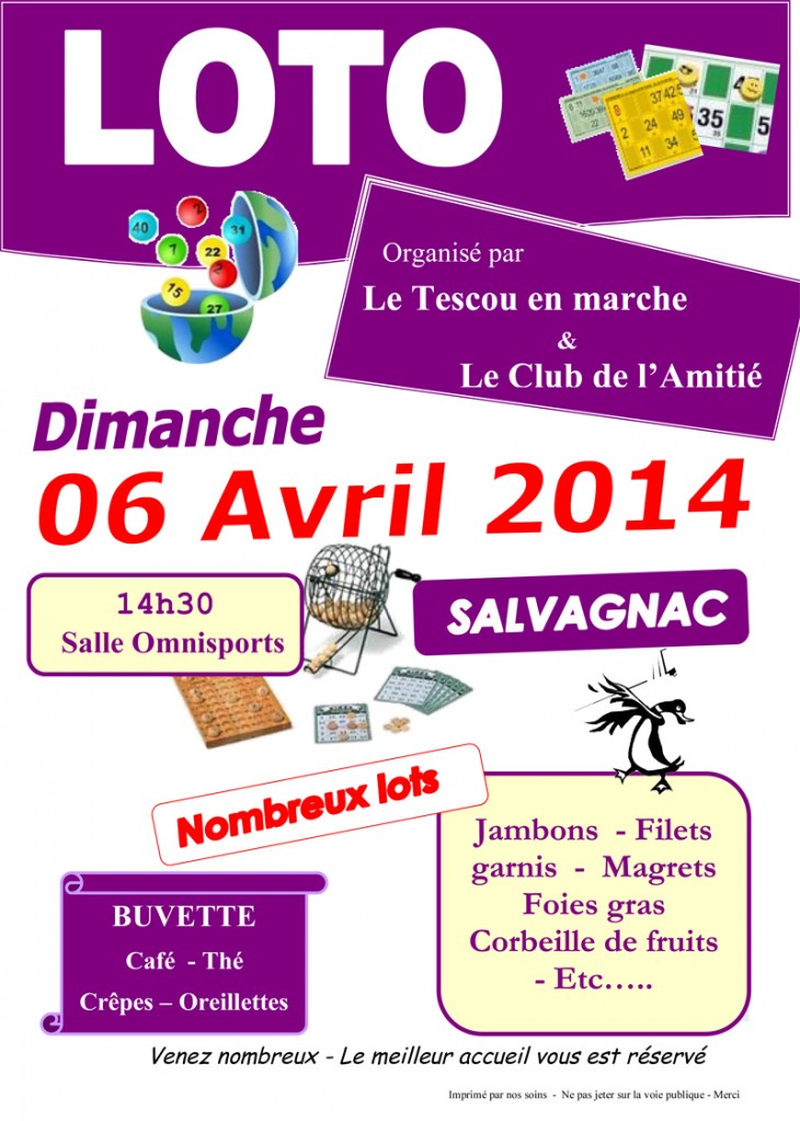 Loto du Tescou en Marche et des aînés … à Salvagnac (81) Loisirs, Salvagnac, N° 97 - Avril 2014 Dimanche 6 avril 2014 aura lieu le loto du Tescou en Marche associé à l’amicale du 3ème âge à Salvagnac. Loto Tescou en Marche 2014 Communiqué par Georgette Gambazza Partager : Cliquer pour envoyer un lien par e-mail à un ami(ouvre dans une nouvelle fenêtre) E-mail Cliquez pour partager sur Facebook(ouvre dans une nouvelle fenêtre) Facebook Cliquez pour partager sur WhatsApp(ouvre dans une nouvelle fenêtre) WhatsApp J’aime ça :J’aime chargement… Similaire SalvagnacainéslotoTescou en Marche