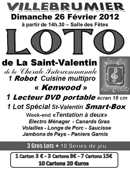 Les conditions météorologiques exceptionnelles de ces derniers jours, ont conduit les responsables de l’Association intercommunale de chant choral « La Clé des Chants » à reporter de 15 jours leur traditionnel LOTO de la Saint-Valentin, qui depuis plusieurs années attire de nombreux joueurs, donnant à ce LOTO un succès grandissant. Ce sera donc le Dimanche 26 Février 2012, avec quelques jours de retard sur le calendrier, que seront mis en jeu les nombreux lots de ce LOTO des amoureux, avec un lot spécial Saint-Valentin « Tentation à deux ».