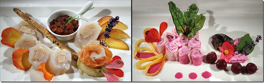 – Des médaillons de lotte fumé au mi cuit de foie gras, rosace de saumon fumé sur fond d’artichaut et chutney de pèche vanille ;