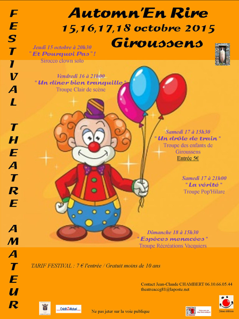 La 2ème édition du Festival de Théâtre « Automn’ en Rire » se déroulera du 15 au 18 Octobre 2015 à la salle de la Boulonnette.