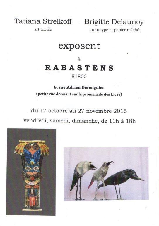 Découvrez la double exposition « Art textile » de Tatiana Strelkoff et « Monotype et papier mâché » de Brigitte Delaunoy du 17 Octobre au 27 Novembre 2015.
