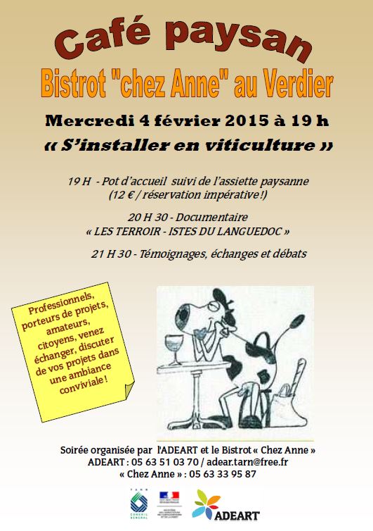 Le prochain Café Paysan organisé par l’ADEART sur le thème « S’installer en viticulture » se déroulera le mercredi 4 février 2015 à partir de 19h, « Chez Anne », au Verdier.