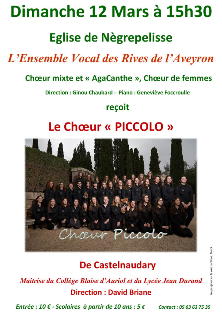 «AgaCanthe» qui regroupe des chanteuses de différents points du département, L’Ensemble Vocal des Rives de l’Aveyron, dirigé par Ginou Chaubard, rythme la vie musicale de Nègrepelisse depuis de nombreuses années, il a le soutien de la municipalité (locaux, services.. ).