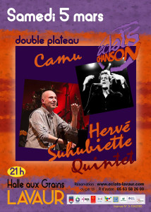Le Samedi 5 Mars 2016, à 21h à la Halle aux grains, Éclats propose un double plateau avec Camu, la jeune et déjà célèbre formation toulousaine en première partie suivie d’Hervé Suhubiette, qu’on ne présente plus, accompagné de quatre musiciens talentueux.