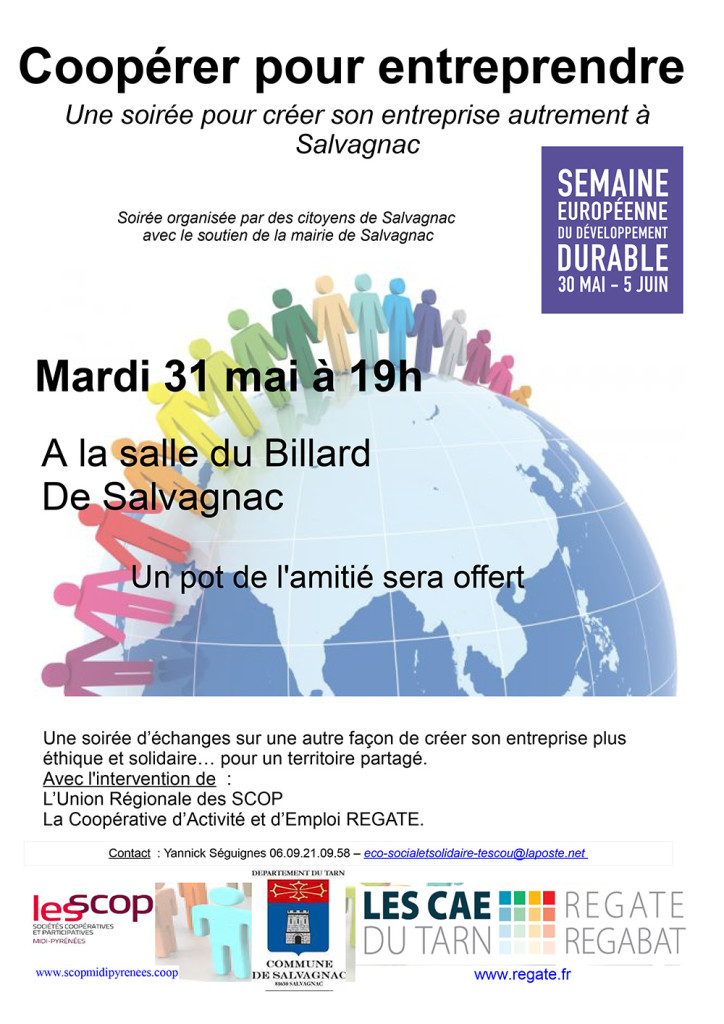 La Coopérative d’Activité et d’Emploi (CAE) REGATE (http://www.regate.fr/) basée à Castres, intervient dans tout le Tarn. Elle propose à tout porteur de projet un accompagnement qui lui permet de tester son activité sous un statut sécurisant de salarié de la coopérative, pour ensuite, si le projet s’avère viable, devenir sociétaire de la coopérative ou repartir dans le monde salarié ou en sortir et créer son entreprise seul. Régate a construit aussi une CAE spécialisée dans le bâtiment : RégaBAT. elle est une des premières structure de ce type, et reset très active. Elle annoncera sûrement des projets de développement et fera venir le soir même des porteurs de projets qui sont passés par son accompagnement.