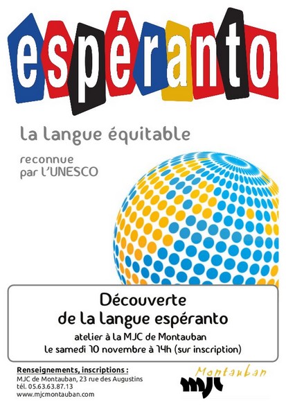 Le samedi 10 novembre 2012 à 14 heures, la MJC de Montauban proposera un atelier intitulé «Découverte de l’espéranto». Vous avez entendu parler de l’espéranto et vous voulez en savoir plus ? Cet atelier est fait pour vous.