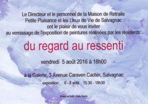 Le vernissage de l’exposition proposée par les résidents de l’EHPAD et des Lieux de vie « Petite Plaisance », accompagnés par Mme et M. Painter, se tiendra le Vendredi 5 Aout 2016, à partir de 18h, à la galerie, Rue Caraven Cachin.