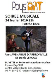 L’Espace Pays ART propose une rétrospective artistique sur tout le week-end avec les artistes disponibles qui ont exposé dans notre espace depuis sa création. Le vernissage sera suivi de l’assemblée générale et d’une grande soirée avec Avénarius D’Ardronville et Denis Leroux en concert avec leur nouveau spectacle « Archimboldé ».