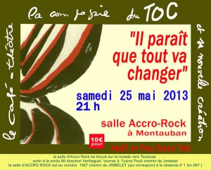 Pas Sans Toit et RESF (Réseau Education Sans Frontières) organisent une soirée café théâtre avec la Compagnie du TOC le Samedi 25 Mai 2013 à 21h.