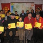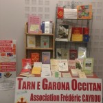 L’humour et la poésie n’ont pas manqué , grâce à Georges Lennoz, (photo) de Saint-Paul d’Espis, qui a animé la « récréation » pendant la correction . Son superbe texte décrivant les mille et uns usages du « avantal de la menina » / du tablier de devant de la mémé fit passer un agréable moment de rire teinté d’émotion : si bien observé que chacun revoyait sa mère ou sa grand-mère faisant tout avec ce fameux « davantal ». Cadeaux et diplômes à tous les participants (photo) précédèrent un final gourmand. Recevant « histoires salées du Moyen-age » offert par TG’OC , le président du Recaliu, Joanol Olivero annonça que le texte de la dictée 2016 risquait d’être « relevé » ! Dans le cadre de cette fête de la langue écrite, TG’OC proposait une intéressante exposition de dictionnaires (occitans et autres langues minoritaires ). A côté des « grands classiques », les participants à la « dictada » ont pu découvrir des ouvrages plus insolites, le plus petit « diccionarelet » (éditeur breton °° 8000 mots) côtoyant le « grand » dictionnaire de Cantalausa, les 7 tomes de Rapin ou le « copieux » Tresor del Felibrige de Mistral. Apprendre le japonais via l’occitan est aussi possible grâce à Naoko Sano comme tout connaître des animaux, du vin et de la vigne et même du langage amoureux avec le dictionnaire de Cupidon !
