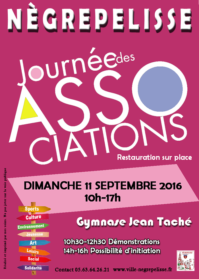 Forum des Associations, organisé par le service associatif municipal, au gymnase Jean Taché, de 10 heures à 17h30. Associations sportives, culturelles, caritatives, économiques, éducatives, il y en aura pour tous les goûts. Fini les vacances, la rentrée a pointé le bout de son nez, il va falloir songer aussi aux activités de toute la famille. Alors puisque rentrée rime avec motivé, soyez nombreux à pousser la porte de la fête pour y découvrir le plus large panel que l’on peut vous proposer ! Petits ou grands, séniors ou encore en activité, chacun aura le plaisir de découvrir une occupation qui lui correspond. Les bénévoles des associations seront là justement pour vous guider dans votre choix et vous faire partager leur passion. La Fête des Associations se tient chaque année à la rentrée. Elle est le reflet de la diversité des activités proposées aux Nègrepelissiens. Amateurs de sport les plus divers, amoureux des arts, désireux d’engagement humanitaire… Chacun peut y trouver son bonheur.