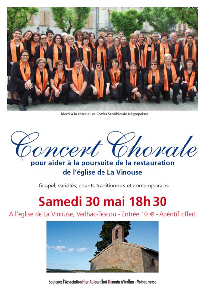 Concert Chorale de soutien pour la poursuite de la restauration de l’église de la Vinouse le Samedi 30 Mai 2015 à 18h30.