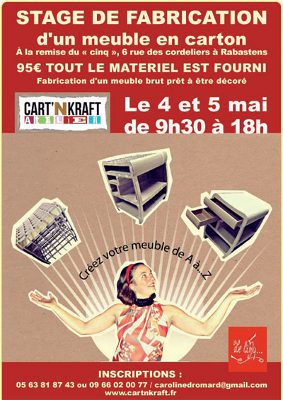 Caroline Dromard vous propose de venir fabriquer votre meuble en carton brut, prêt à décorer, vous pourrez choisir parmi 3 gabarits de l’atelier.