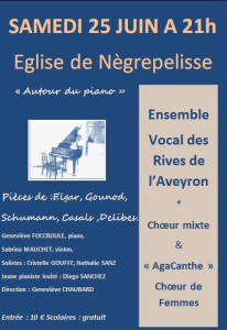 L’Ensemble Vocal des Rives de l’Aveyron (Chœur à voix mixte et « AgaCanthe », Chœur féminin) propose un concert « Autour du piano », avec des pièces de compositeurs des 19ème et début 20ème siècle : Amadeu Vives, Robert Schumann, Charles Gounod, Edward Elgar, Léo Delibes, Pablo Casals, et autres …