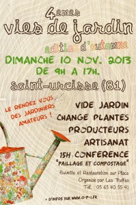 … Et tout particulièrement bien sûr au change plantes des 4èmes Vies de jardin de Saint-Urcisse (81), édition d’automne, le Dimanche 10 novembre 2013. Surtout n’oubliez pas à 15h, dans la salle des fêtes du village, la conférence traitant du compostage et du paillage qui sont au jardinage ce qu’étaient à la France labourage et pâturage, de l’avis de Sully, ministre d’Henri IV.