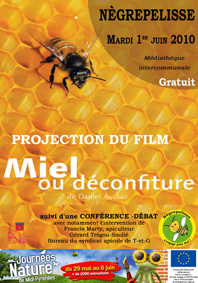 Le Mardi 1er Juin, à 20h30, à la médiathèque de Nègrepelisse. Projection du film « Miel et déconfiture » de Daniel Auclair suivi d’une conférence-débat avec notamment l’intervention de Francis Marty, apiculteur et Gérard Trégou-Soulié du Bureau du syndicat apicole de Tarn et Garonne.
