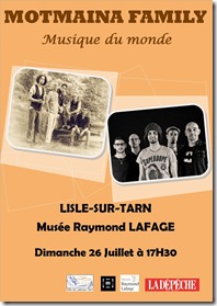 Dans le cadre de son exposition : « BLACHON : dessinateur humoristique et sportif » et poursuivant son cycle de conférences et d’animations le musée Raymond LAFAGE, vous propose ce dimanche 26 juillet 2015 à partir de 17h30, le groupe Motmaïna Family en concert.