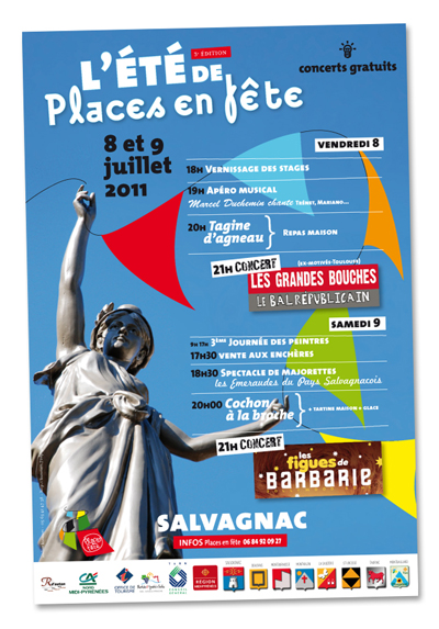 Places en Fête vous présente les temps forts de l’animation de l’été 2011, du 2 au 9 juillet, dans le Canton de Salvagnac : Les Expos Vagabondes, Les stages de création et, en clôture de ces 8 jours, La fête !