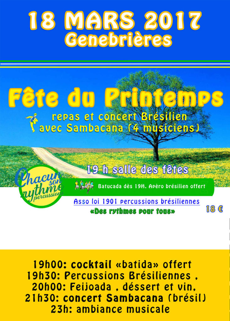 Cette année nos papilles et nos oreilles s’envoleront au Brésil le Samedi 18 Mars 2017 pour la quatrième édition de la Fête du Printemps ! Repas Brésilien typique suivi du concert des 4 musiciens du groupe afro-brésilien Sambacana. Ambiance, danse et bonne humeur assurées.