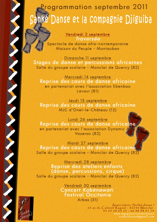 Voici toutes les dates auxquelles vous pourrez voir l’association Sanké, Danse ! et la Compagnie Djiguiba au cours de ce mois de Septembre 2011.