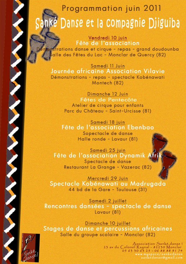 Voici toutes les dates auxquelles vous pourrez voir L’association Sanké, Danse ! et la Compagnie Djiguiba au cours de ce mois de Juin 2011.