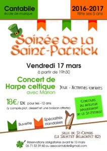 Au programme : concert de Harpe celtique avec Marion Pollet (professeur de Cantabile), initiations à la harpe pour tous, concours du meilleur déguisement de la St-Patrick, jeux, chansons, activités enfant, buvette.
