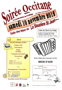 Pour la 4ème année consécutive, le conservatoire de l’outillage du pays des Bastides, organise une soirée occitane, repas et animation folklorique, le samedi 10 novembre 2012, à la salle des fêtes de La Sauzière.