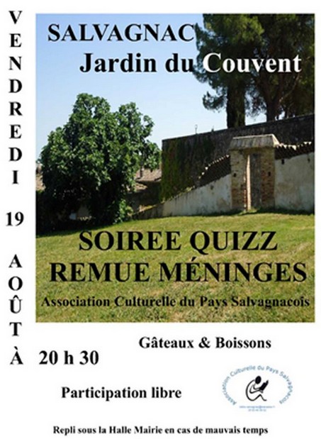 L’association culturelle qui gère la bibliothèque de Salvagnac organise une soirée quiz remue méninges le Vendredi 19 Août 2016, à 20h30, dans le jardin du couvent. (Repli sous la halle de la Mairie en cas de mauvais temps.)