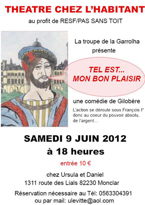 Pas Sans Toit et RESF organisent une soirée théâtre chez l’habitant le Samedi 9 Juin 2012 à 18h à Monclar de Quercy.