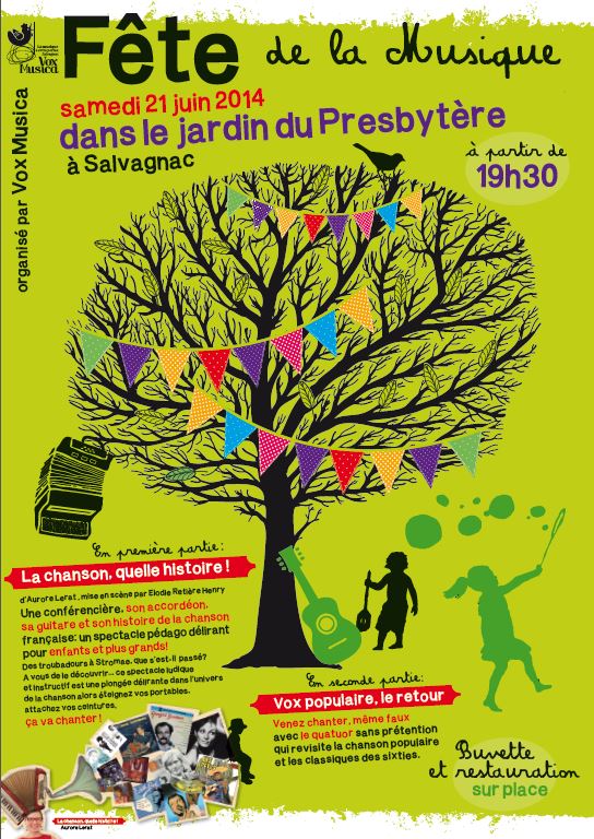 La fête de la musique organisé par Vox Musica, se déroulera samedi 21 juin 2014 à partir de 19h30 dans le jardin du Presbytère.
