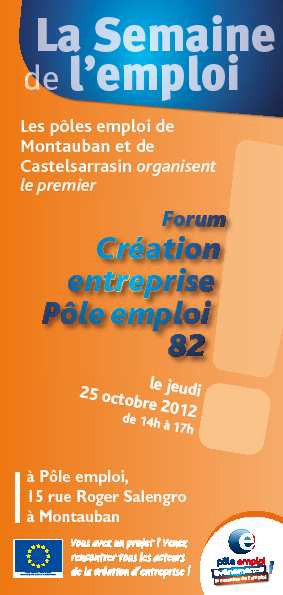Les Pôles Emploi de Montauban et Castelsarrasin organisent le 1er Forum Création Entreprise Pole Emploi 82, le Jeudi 25 Octobre 2012 de 14h à 17h.