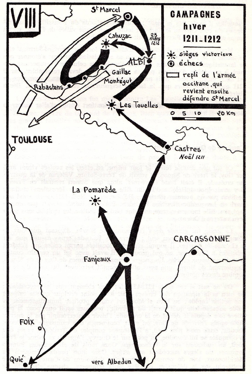 Dans sa retraite sur Toulouse, si Raimond VI a renoncé à défendre l’Albigeois, il a néanmoins gardé trois places fortes, solides points d’appui, au Nord du Tarn, Saint-Marcel, puis sur l’Aveyron, les villes de Penne d’Albigeois et Saint-Antonin-Nobleval. Au demeurant, ce repli n’a certainement pas le sens d’un abandon, mais d’une tactique souple, visant à disperser les croisés et à désorganiser leur plan. En effet, à peine ont-ils mis le siège devant Saint-Marcel, d’un côté seulement de la ville, en raison de l’insuffisance de leurs troupes, que les trois comtes opèrent un brusque retour offensif. Ils pénètrent dans la place avec leurs armées. Ils se joignent ainsi à la garnison méridionale, laquelle bénéficie dès lors d’une écrasante supériorité numérique.