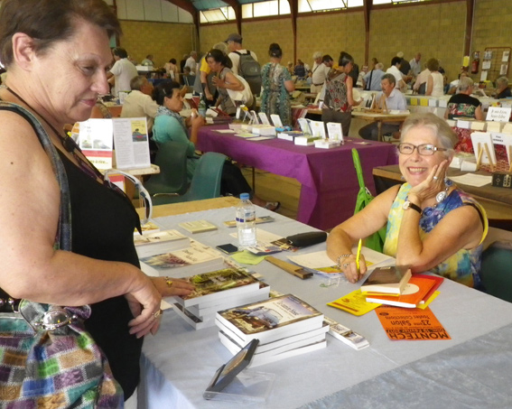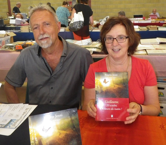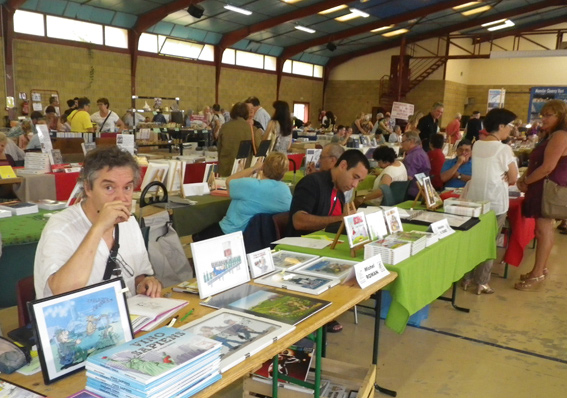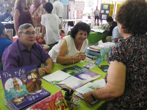 Côté visiteurs, il y a les « randonneurs fugaces », rares heureusement… qui arpentent les allées à une vitesse telle qu’on peut simplement imaginer qu’ils sont venus se mettre à l’ombre ou nous faire de l’air : leurs regards sont droits alors que les livres sont sur les côtés ! Il y a les « regardants en coin » qui ne voient pas les livres sur les côtés car leurs yeux réglés trop bas ne voient que la nappe et parfois vos chaussures ( d’où l’importance pour tout auteur qui se respecte d’avoir grand souci de celles-ci !) ! Il y a les « déréglés de la mire » qui, arrivés à votre niveau, regardent les livres de la table suivante ou ceux de la précédente, bref jamais la vôtre ! Les « radars fixes » qui fixent vos livres et ne verront jamais même si vous faites les plus savantes pirouettes ou chantez La Traviata, que vous, l’auteur évidemment exceptionnel et adulé par les foules normales, êtes juste derrière ! Mais quel sombre tableau me direz-vous ? Bien entendu, ce dimanche 28 août à Monclar de Quercy, point d’aussi légers et indélicats visiteurs ou si peu. Il y eut les « ceux » qui voulaient le dernier « Durrieu-Mallet-Vernhes-Laprade-Cavalié-Caujolle… », des fidèles d’entre les fidèles, d’autres aussi qui prenaient le temps de découvrir vos mots et vos écrits, de discuter de vous, d’eux, de tout de rien, de la vie… ceux qui vous offraient leurs regards clairs et vous donnaient de si belles raisons d’espérer et sans le savoir vous emmenaient la plume un peu plus loin, ceux qui acceptaient de partir en voyage avec vous et vous honoraient de leurs futures lectures… prêts à vous emboîter la plume. Oui, ils étaient bien là ceux-là et donnèrent de si belles couleurs à la fête !
