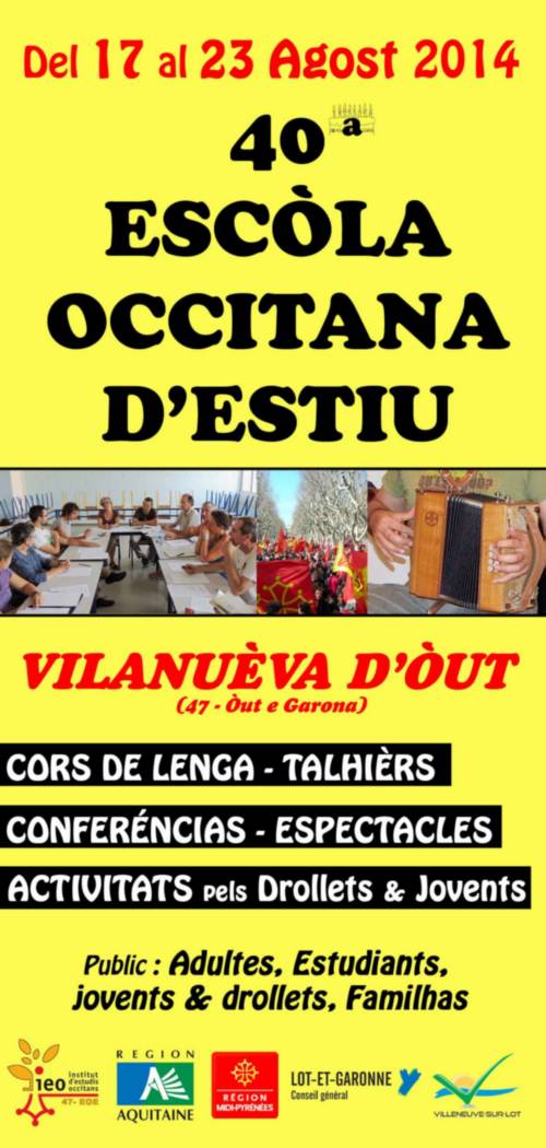 Del 17 al 23 d’agost de 2014 se tendrà al Licèu “L’Oustal” a Vilanuèva d’Oùt (47), la 40a edicion de l’Escòla Occitana d’Estiu.