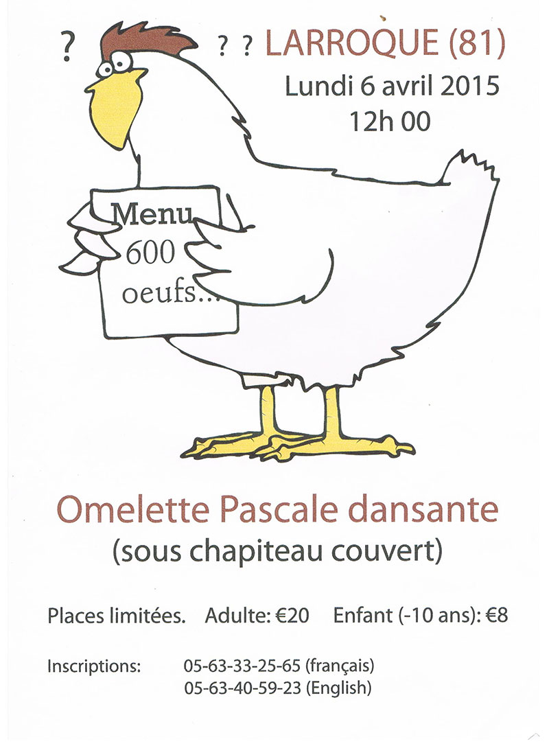 L’Association pour la rénovation de la Commune de Larroque organise le lundi 6 avril 2015 une omelette pascale dansante sous chapiteau et en bord de Vere.
