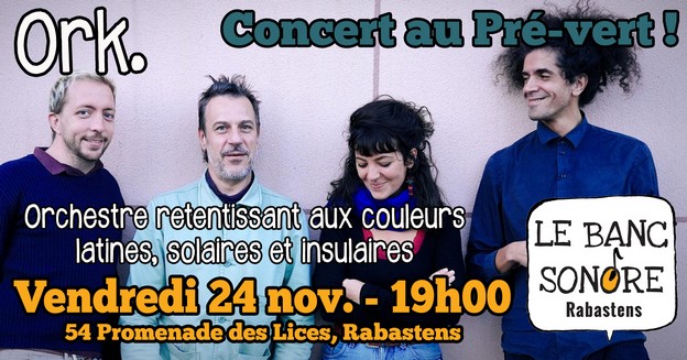 En raison de la non-disponibilité de la Halle le 24 novembre, nous organisons notre soirée concert de Vendredi au Pré-Vert avec Ork, un orchestre retentissant aux couleurs latines, solaires et insulaires. De quoi apporter le soleil dans ce triste mois de Novembre.