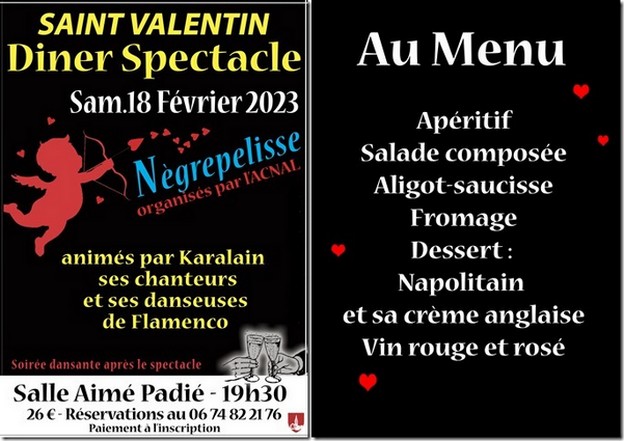 Diner-spectacle Saint Valentin …à Nègrepelisse A côté de chez nous, Loisirs, N° 203 - Février 2023 Samedi 18 février 2023, à 19h.30, salle Aimé Padié. Partager : Cliquer pour envoyer un lien par e-mail à un ami(ouvre dans une nouvelle fenêtre) E-mail Cliquez pour partager sur Facebook(ouvre dans une nouvelle fenêtre) Facebook Cliquez pour partager sur WhatsApp(ouvre dans une nouvelle fenêtre) WhatsApp J’aime ça :J’aime chargement… Similaire diner spectacleCentre Aimé PADIENègrepelissesaint valentin
