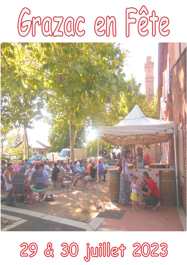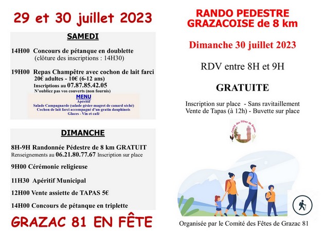 29 et 30 juillet 2023, Le comité des Fêtes de Grazac vous donne RDV au village de Grazac 81 ! Au programme, samedi concours de pétanque, Bal animé par le DJ TOINOU, un repas champêtre sur réservation obligatoire au 07 87 85 42 05 et dimanche grand retour de la rando pédestre RDV entre 8h et 9h pour un circuit de 8 km (gratuite et sans ravitaillement), suivi d’un apéritif offert par la Municipalité. À partir de 12h vente d’assiettes de tapas et 14h concours de pétanque qui clôturera ce WE festif.