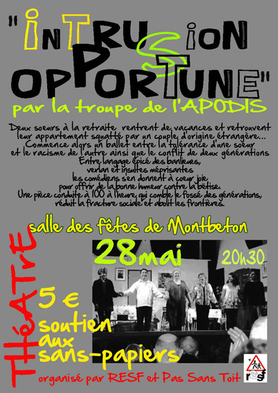 La troupe de l’Apodis (qui jouera bénévolement) nous présentera sa pièce « Intrusion Opportune » le Vendredi 28 Mai à 20H30 à la salle polyvalente de Montbeton ( et non à la salle du Tire-Crabe).