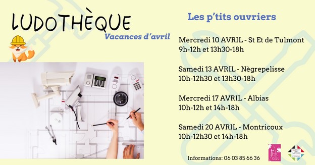 C’est le chantier à la ludothèque ! Venez retrouver l’ambiance préférée de vos enfants avec casques, pique-nique sur le pouce, réunion de chefs de travaux, élaboration de plans … Couper du carton sans se couper ou encore construire d’immenses cabanes, c’est le défi que l’on donne à vos enfants : mais pas que ! Une journée entière par médiathèque est dédiée pour ces vacances : on vous attend nombreux !