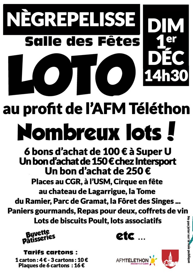 Loto au profit du Téléthon…à Nègrepelisse (82) Parlons-en !, A côté de chez nous, N° 225 - Décembre 2024 1 décembre 2024 de 14h30 à 17h30 Planifié ical Google outlook Parlons-en ! A côté de chez nous N° 225 - Décembre 2024 Salle des fêtes de Nègrepelisse 82800, France Carte Dimanche 1er décembre 2024, à 14h.30 à la salle des fête information communiquée par Aurore DEFFRENE Retrouvez tous les événements dans l’agenda ! Partager : Cliquer pour envoyer un lien par e-mail à un ami(ouvre dans une nouvelle fenêtre) E-mail Cliquez pour partager sur Facebook(ouvre dans une nouvelle fenêtre) Facebook Cliquez pour partager sur WhatsApp(ouvre dans une nouvelle fenêtre) WhatsApp J’aime ça :J’aime chargement… Similaire S4824TéléthonNègrepelisseloto