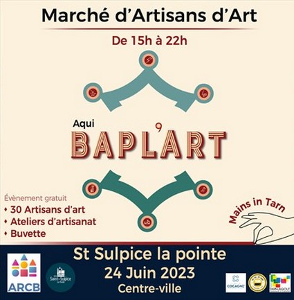Aqui Bapl’art : L’art qui va bien ! Un marché artisanal « Mains in Tarn » à St Sulpice la pointe le 24 Juin 2023 et à St Lieux les Lavaur (Ludolac) le 21 et 22 Juillet 2023.