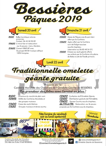 Du samedi 20 au lundi 22 avril 2019, place du village. Durant le week-end de Pâques, la Confrérie Mondiale des Chevaliers de l’Omelette Géante de Bessières animera la place du village comme depuis 46 ans maintenant.