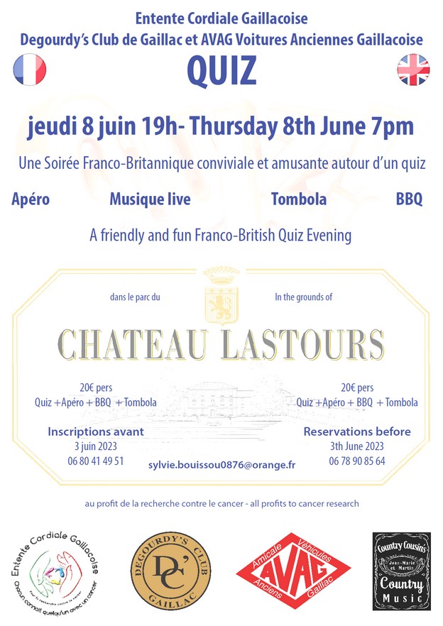 Le 8 juin 2023, 19h, Château Lastours Quiz, Apero, Dîner, Tombola, Musique Live Le succès du dîner dansant de février a montré que les Gaillacois veulent toujours montrer leur soutien : et ils l’ont fait avec 10.400€. Merci à tous.