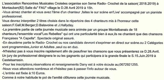 Dimanche 28 avril 2019, salle du FAU, à 15 h.