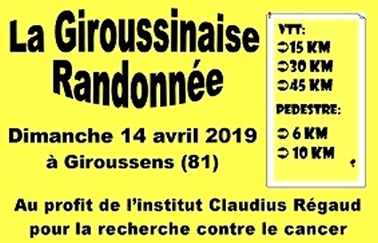 NOTA: Devant le succès remporté par la randonnée pédestre et afin d’éviter une trop longue attente à l’inscription, nous vous proposons de télécharger le bulletin d’inscription, de le remplir et de nous l’apporter avec votre règlement (les chèques doivent être établis au nom du Comité des fêtes de Giroussens qui transmettra un chèque global à Claudius Regaud). Pour rappel, en 2018 nous avons pu verser plus de 3000 € à Claudius Régaud grâce à La Giroussinaise VTT et pédestre.